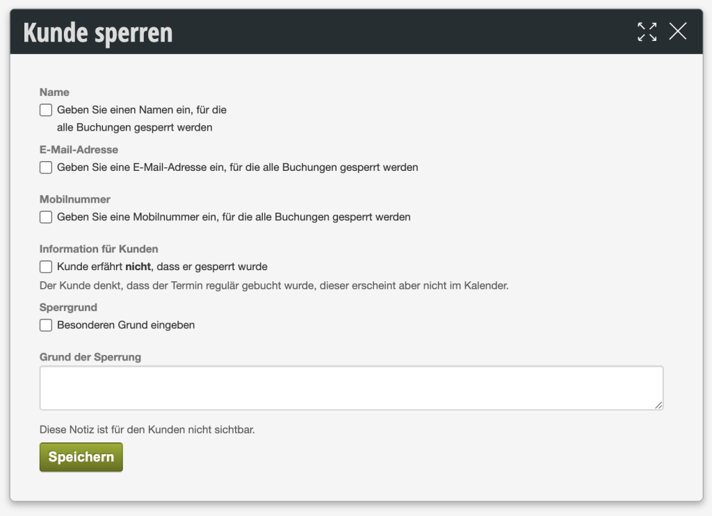 Anhand von E-Mail-Adresse oder Handynummer können die Terminbuchungen bestimmter Kunden verhindert werden. Dies ist auch möglich, wenn Sie die Onlinebuchung ohne vorherige Registrierung ermöglichen möchten. Kunden, welche bereits registriert sind, können über die Kundenkartei gesperrt werden, wenn Sie die Buchung ohne Registrierung ohnehin nicht anbieten.