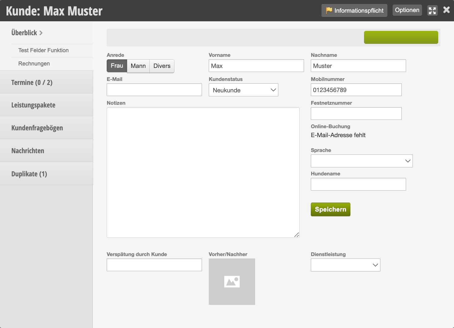Sobald Sie auf den blau unterlegten Kundennamen klicken, gelangen Sie in die Kundenkartei des Kunden und können alle Informationen zu diesem Kunden einsehen und bearbeiten.