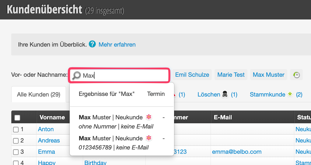 Um bestimmte Kunden zu finden, können Sie das Suchfeld im oberen Bereich der Seite nutzen.