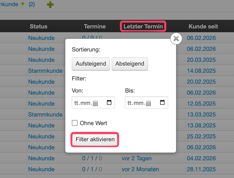 Sobald Sie auf eine der Tabellenspalten klicken, gelangen Sie in die Filterübersicht und können verschiedene Filter auswählen, z. B. um nach Kunden zu suchen, die länger nicht mehr da waren.