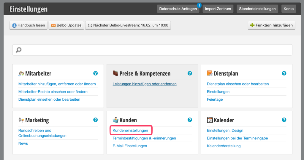 Sie wollen die Suche erweitern? Angenommen, sie wollen nach dem umsatzstärksten Kunden suchen, dann können Sie dies mit Hilfe von zusätzlichen Tabellenspalten tun. Dazu müssen Sie in die Einstellungen gehen und auf „Kundeneinstellungen“ klicken.