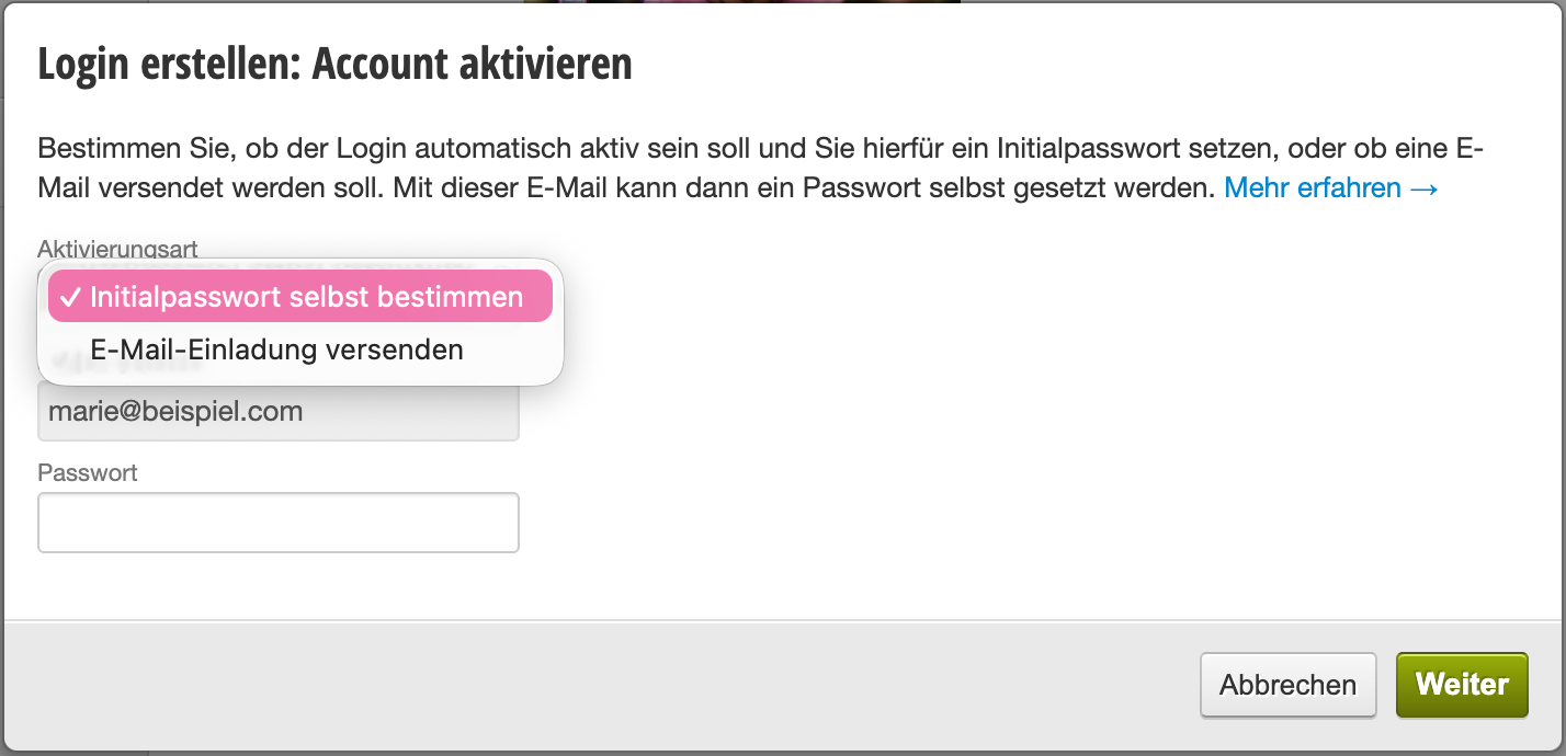 - Initialpasswort selbst bestimmen: Sie haben die Möglichkeit, das Passwort sofort selbst zu bestimmen. Teilen Sie dies anschließend der Person mit, welche Zugriff auf den Login haben soll.