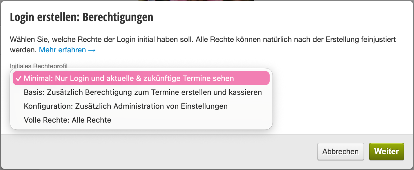 Für jeden Login können Sie individuelle Zugriffsrechte vergeben. So stellen Sie sicher, dass die Person, welche über den Login verfügt, nur diejenigen Daten einsehen oder ändern kann, für welche sie berechtigt ist. Während Sie einen Login erstellen, können Sie zwischen verschiedenen Optionen wählen, welche die Einrichtung erleichtern. Nachdem Sie den Login fertig erstellt haben, können Sie die Rechte für diesen Login jederzeit unter Einstellungen > Mitarbeiter > Rechte einsehen und bearbeiten.