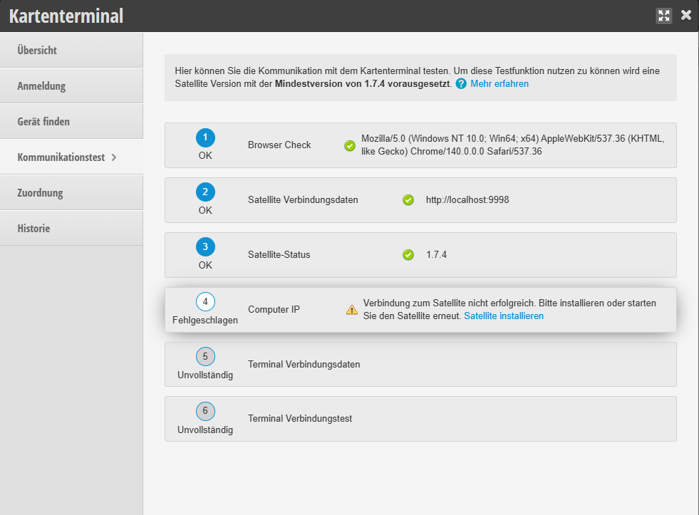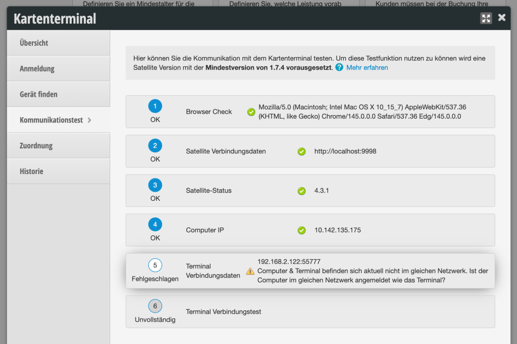 Hier ein klassisches Beispiel dafür, dass sich das Terminal nicht im gleichen Netzwerk wie der Computer befindet, möglicherweise durch ein WLAN Wechsel.