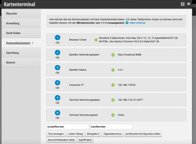 Um das Problem einzugrenzen ist es wichtig, ob die Zahlung bereits funktioniert hat. Ist dies der Fall, liegt vermutlich ein Netzwerkproblem vor, welches durch den Kommunikationstest in der Funktion „Kartenterminal“ bestätigt werden kann. Führen Sie daher bitte zuerst den Kommunikationstest in der Funktion aus und senden Sie diesen Screenshot in den Hilfechat oder per E-Mail an info@belbo.com, falls Sie ein Foto mit dem Handy machen, wenn Sie selbst nicht weiter kommen.