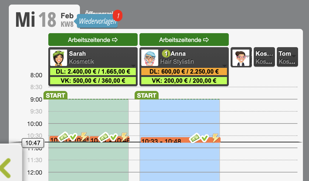 Definieren Sie zunächst den gewünschten Stundenumsatz pro Mitarbeiter. Auf Grundlage der hinterlegten Arbeitszeiten errechnet das System automatisch das entsprechende Tagesumsatzziel. Im Kalender werden anschließend sowohl der aus den geplanten Terminen resultierende Umsatz als auch das festgelegte Umsatzziel übersichtlich gegenübergestellt.