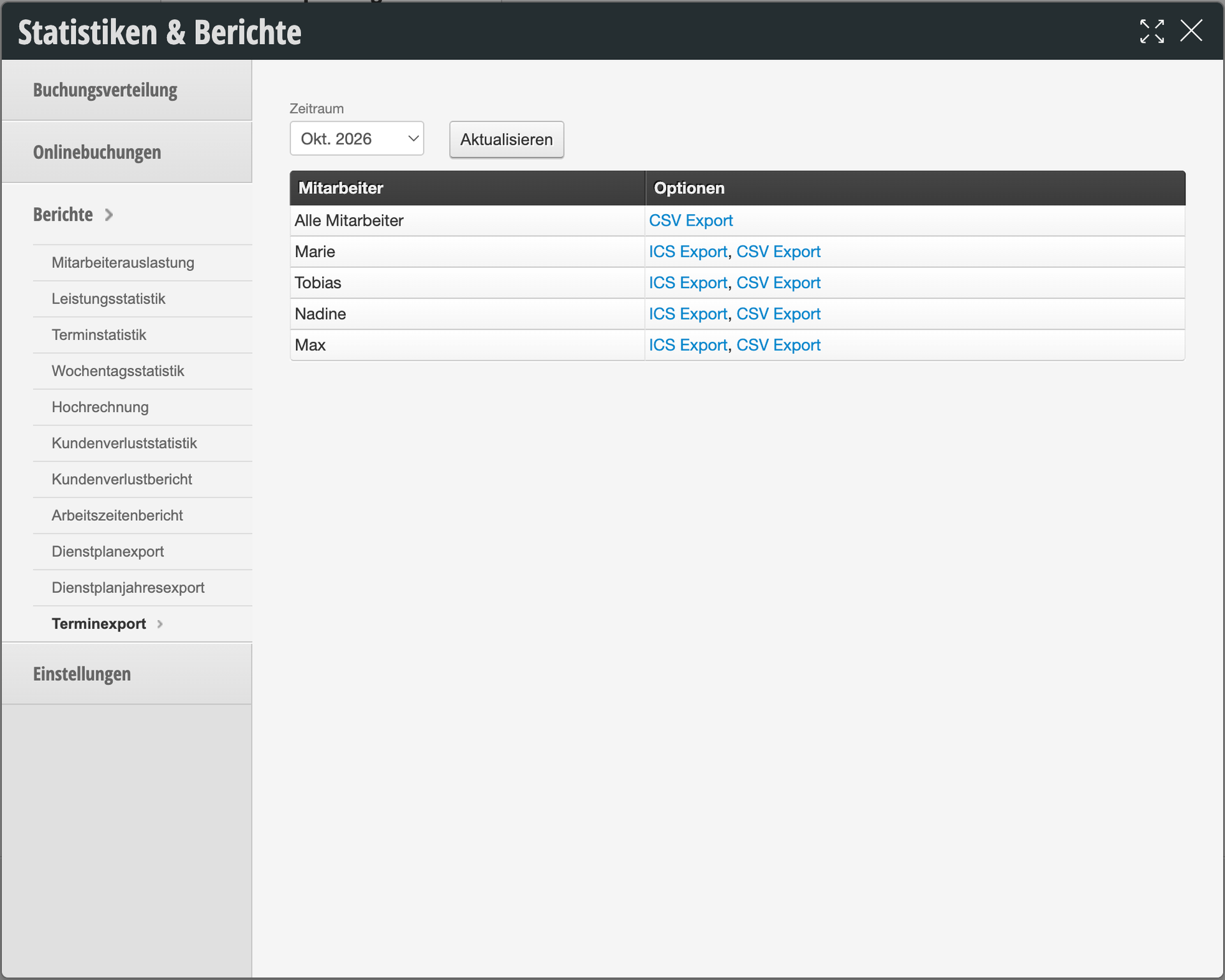 - Um die Termine aller Mitarbeiter eines Monats herunterzuladen, klicken Sie auf den Link „CSV“ neben einem Monat.